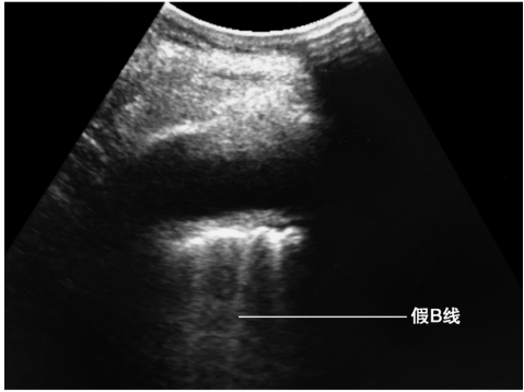 与胸膜线平行的数条高回声伪影,属于混响伪像。提示肺内含有气体。