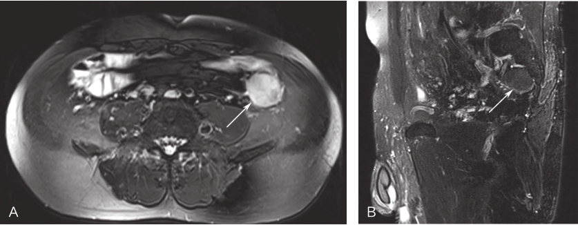 A.横断面;B.矢状面,左下腹见一类圆形异常信号影,结肠GIST