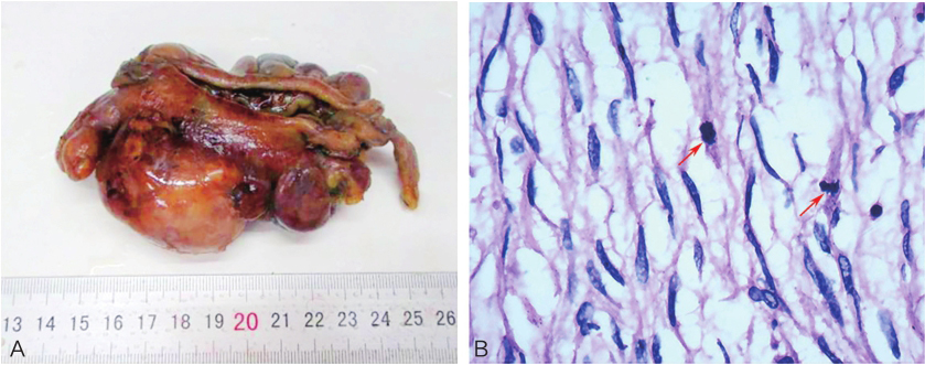 A.肿瘤大体标本;B.HE染色×40倍,可见核分裂象