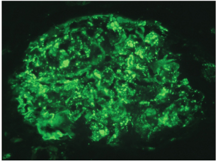 乙肝五项:抗-HBs(+),余均阴性。抗HCV抗体和抗HIV抗体均(-)。IgG 4.08g/L↓,IgA 和 IgM 正常,C3 0.5g/L↓,C4 0.18g/L;CRP<1.00mg/L,RF<20.0U/ml;冷球蛋白(-);ANA、抗ds-DNA抗体及ENA谱均阴性;血、尿免疫固定电泳未见单克隆区带。