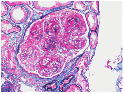图2 MPGN型C3肾小球肾炎:肾小球系膜细胞增生和系膜基质增多,毛细血管壁增厚,双轨征形成(PASM+Masson×200)