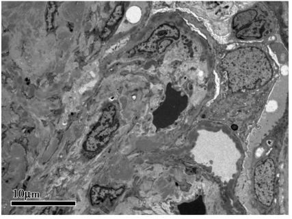 图3 MPGN型C3肾小球肾炎:系膜区和内皮下电子致密物沉积,上皮细胞足突节段性融合(电镜×4 000)