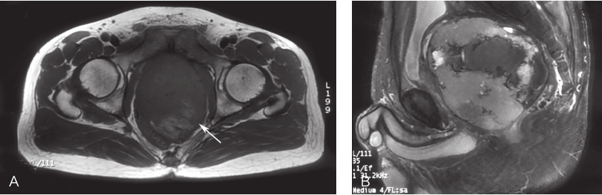 2017年3月盆腔MRI示:盆底直肠膀胱间隙见T2较高T1较低信号软组织影,直径约10cm,病变内部信号不均匀,见多发不规则大片状T1较高T2等信号区,并见气-液平面,考虑间叶组织源性肿瘤伴瘤内出血;DWI序列环周呈高信号,中心大片呈低信号区;病灶推挤膀胱、前列腺及精囊向前上方移位,推挤直肠向后移位,大部分边界清。