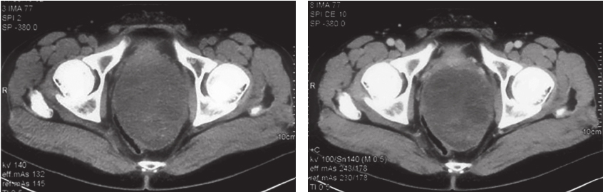 从2017年4月10日起,开始口服甲磺酸伊马替尼400mg/d。服药后每月复查盆腔MRI,示肿瘤无明显变化。考虑患者术前伊马替尼靶向治疗2月余,肿物仍无明显缩小,患者系c-KIT外显子9突变,该型突变对伊马替尼反应欠佳,建议患者增加剂量至600mg/d。患者遵医嘱于2017年6月28日开始加量。伊马替尼加量后2个月复查盆腔MRI,示肿物大小较前仍无显著变化(Choi标准:SD状态)。加做腹盆腔增强CT:盆腔内直肠膀胱窝见一巨大类椭圆形实性肿物,考虑GIST或其他间叶源性肿瘤,肿物边缘光滑,可见包膜,与精囊、前列腺及直肠分界不清,肿物大小约11.7cm×8.9cm,密度欠均匀,内见条片形稍高密度影及散在钙化灶(图2)。