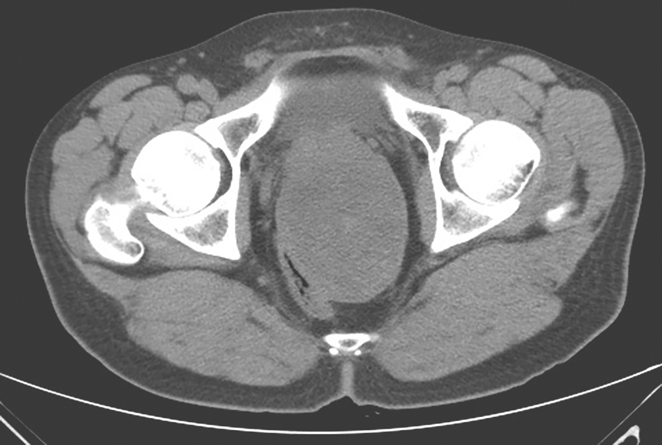 2018年10月胸腹盆腔增强CT(图4):①盆腔见一软组织肿块,大小约9.1cm×7.3cm,边界尚清,挤压相邻直肠、前列腺及双侧精囊,局部分界稍欠清,平扫内部密度不均,可见点状及片状稍高密度灶,增强扫描强化不明显;②肝脏大小形态未见异常,表面光滑,肝叶比例协调,肝实质内见小囊状低密度灶,大小约0.3cm,增强扫描未见强化;③腹腔未见液性密度影,腹腔及腹膜后未见明显淋巴结肿大。