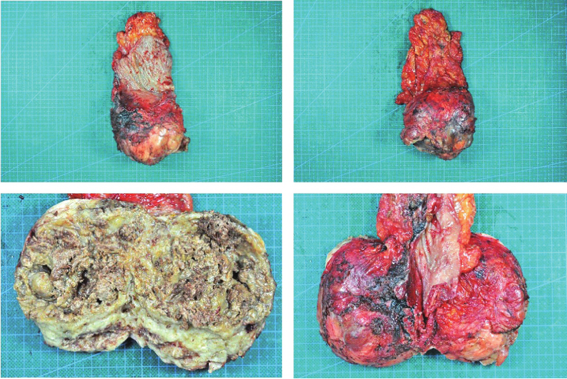 标本情况(图5):肿物位于直肠下段侧壁,大小约9cm×8cm×7cm,累及前列腺后壁,假包膜完整。