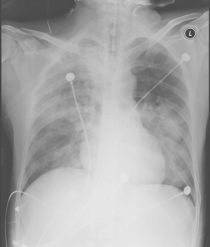 X线胸片(急诊):右肺及左肺中下野可见大片絮状模糊影(图1)。