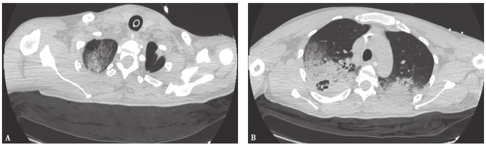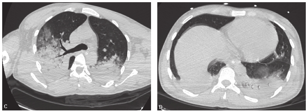 胸部CT:双肺多发大片磨玻璃及实变影,右肺上叶后段空洞形成,双侧胸腔积液(图2)。