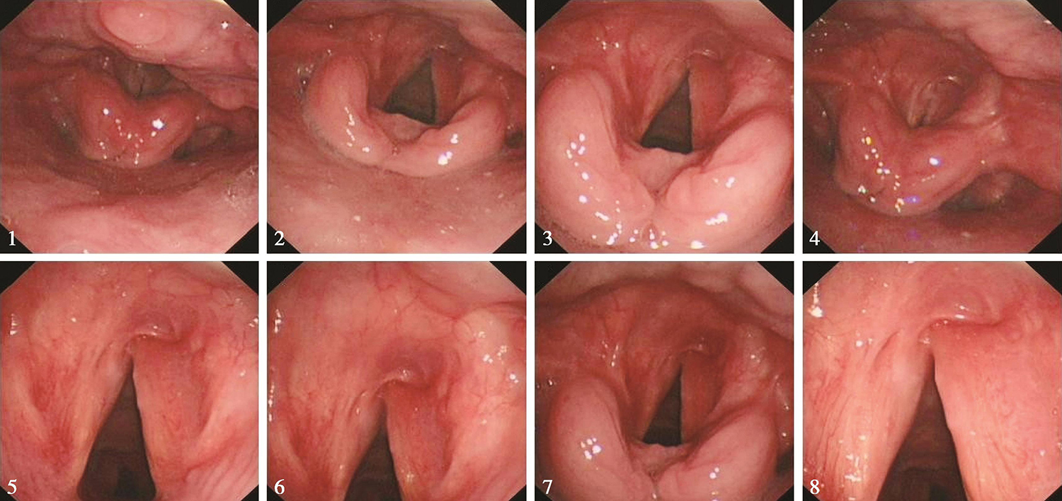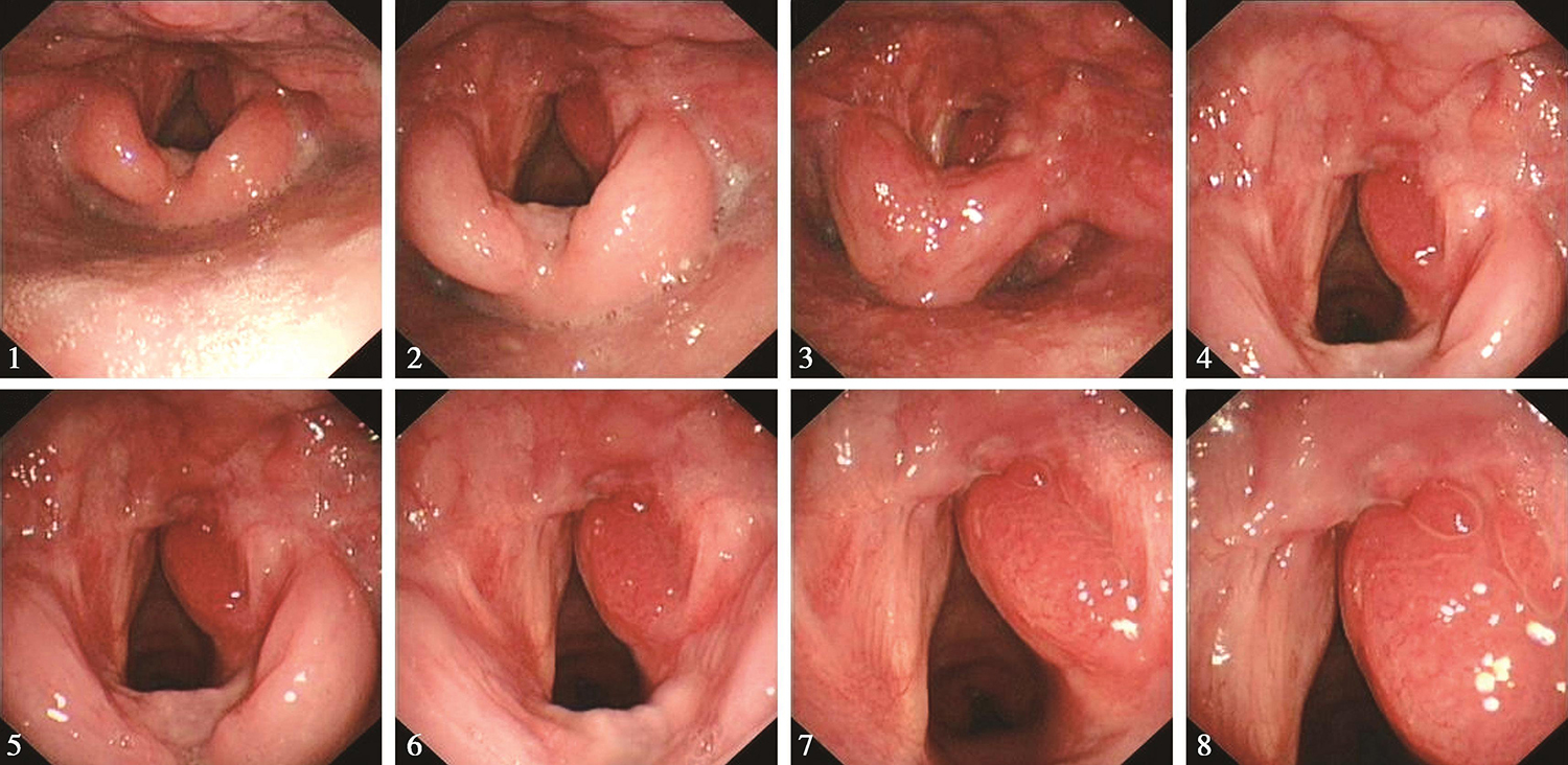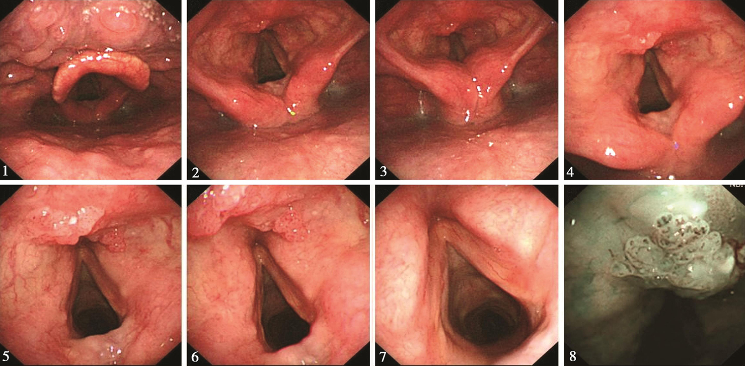 3.2017年3月15日电子内镜检查所见:“喉癌术后3个月”,鼻腔进镜顺利。鼻咽部结构完整,黏膜光滑,未见明显异常。口咽双侧扁桃体未见肿大。舌根部淋巴滤泡增生。下咽部表面基本平整,未见明显异常。喉部呈术后改变,会厌切除,双侧披裂保留,术区表面基本平整,左侧声带光滑,右侧声带肿胀明显,双侧声带活动正常(图3)。