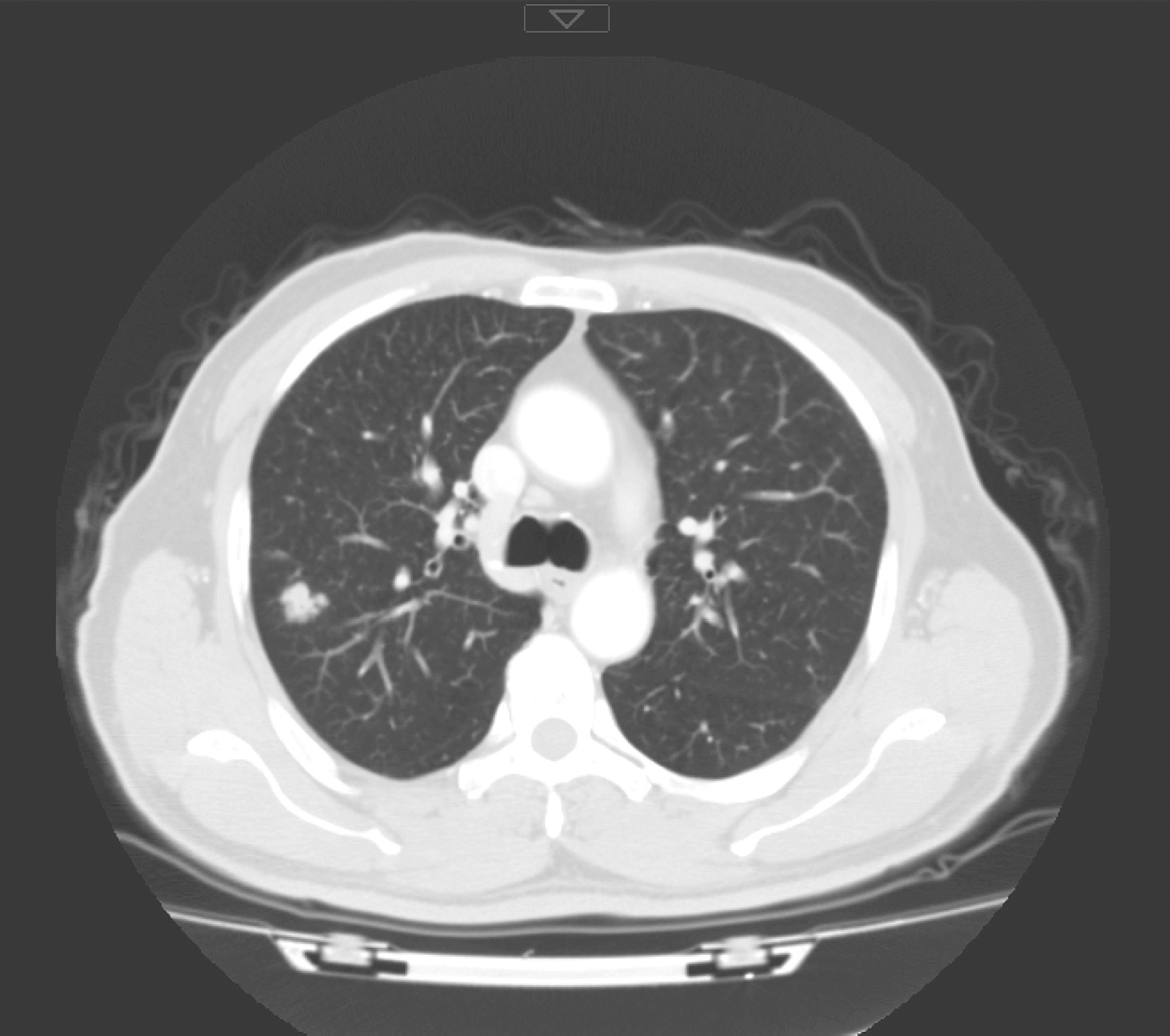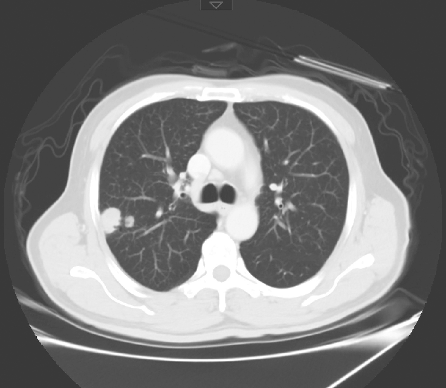 (5)右肺上叶后段多个结节较前增多、增大,部分融合成团,现大者最大截面约2.4cm×1.8cm(图5),需高度警惕恶性,转移瘤或原发肺癌待鉴别,请结合临床,建议活检。余双肺可见多发小结节,部分为新出现,大者约0.4cm,转移瘤可能性大。
