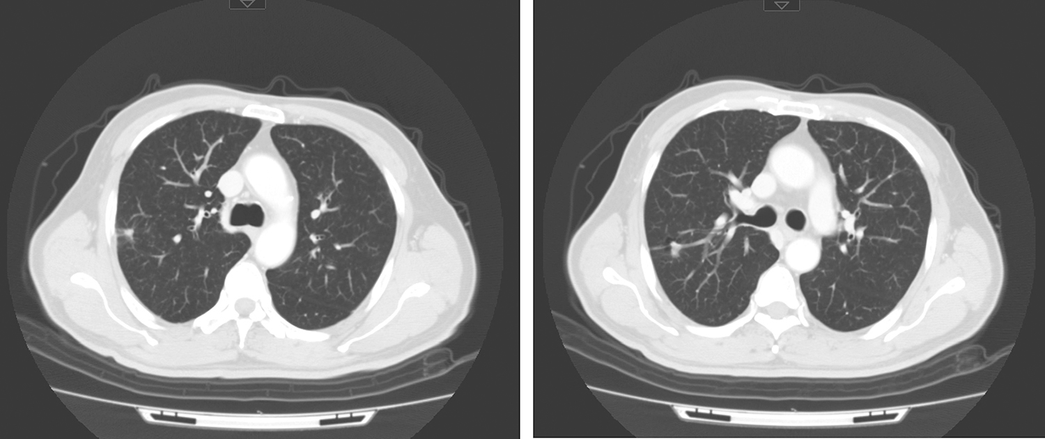 5.2017年3月15日门诊复查见,胸部CT右肺上叶结节,胸科会诊建议手术或抗结核治疗1个月后复查。
