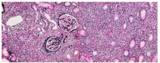 血常规:WBC 5.09×109/L,中性粒细胞59.5%,嗜酸性粒细胞3.1%,Hb 111g/L,PLT 362×109/L;尿蛋白(-),尿红细胞 0~3/HP,尿糖(-),尿微量白蛋白 34mg/L,N-乙酰-β-D-葡萄糖苷酶(NAG) 36U/L,α1-MG127mg/L。 肝功能正常,TP 84.1g/L,ALB 42.3g/L,BUN 7.7mmol/L,SCr 153.7μmol/L(44~133μmol/L),UA 414μmol/L,电解质正常,胰淀粉酶正常。IgG 17.9g/L,IgA 1.61g/L,IgM 1.11g/L,C3 0.71g/L,C4 0.33g/L。 ANA、ANCA 均阴性。