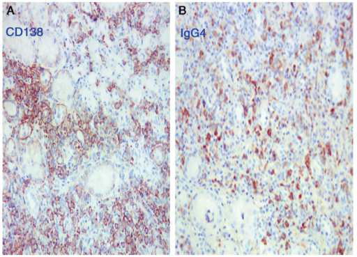 图2 IgG4相关性间质性肾炎:A:肾间质内大量CD138阳性的浆细胞浸润(免疫组化×400);B:肾间质的浆细胞多数产生IgG4(>40%)(免疫组化×400)