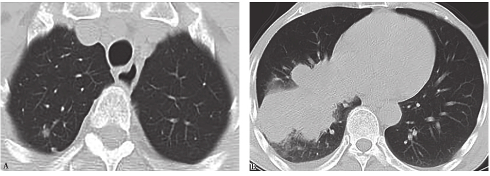 糖尿病患者为肺结核的高发人群,比普通人群肺结核的患病率高4~8倍。糖尿病引起的高血糖、酮症酸中毒等因素可促进结核分枝杆菌生长繁殖,降低细胞吞噬功能,因此,糖尿病合并肺结核病情往往比单纯肺结核要重,并且在影像学上常有一些特征性表现:①发病部位不固定;②病灶分布范围广,进展快,形态多样,主要有大片融合影、斑片影、空洞、树芽状支气管播散灶、结节、肿块及纤维条索影等形态,并且同一病例可同时出现多种形态的病变。