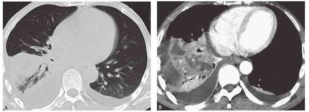 胸部CT可见右肺上叶结节,右下肺实变伴胸腔积液