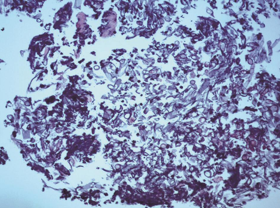 肺毛霉菌病一般急性或亚急性起病,临床表现没有特异性,可表现为发热、咳嗽、咳痰、咯血、胸痛和呼吸困难等。其胸部影像学表现可有渗出、实变、结节、空洞、晕征及纵隔淋巴结肿大等,亦缺乏特异性。此外,还可出现肺不张、胸腔积液、肺梗死等。肺毛霉菌病的确诊主要依赖肺组织活检。