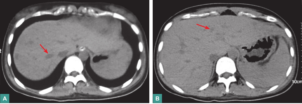 本病例发热、炎症指标升高,腹部CT提示多发低密度灶,无既往肝脏影像学资料,不能排除单纯性肝囊肿继发感染可能,但患者肝内病灶大小不一,形状不规则,不符合肝囊肿特点,可行CT增强扫描进一步排除。