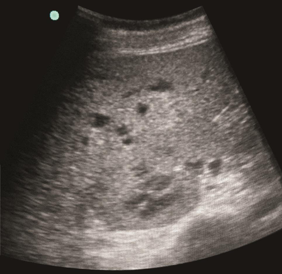 患者入院后,予亚胺培南/西司他丁(1g,每8小时1次)抗感染治疗,辅以磷酸肌酸钠改善心肌代谢,并继续给予抑制胃酸、保护胃肠黏膜、营养支持(滋养型肠内营养联合静脉营养)、调节肠道微生态、保肝等治疗。床旁腹部超声检查发现中等量腹水,置管引流出淡黄色微浑液体1800ml。腹水常规:白细胞计数2548×109/L,多核细胞76%。入院第4日,鉴于患者腹痛无缓解,且有发热(体温达38.5℃),复查CRP 75.1mg/L,外周血WBC 13.1×109/L,N% 83.0%,不排除合并肠道革兰阳性球菌感染可能,遂加用利奈唑胺(600mg,每12小时1次)加强抗感染治疗。治疗1周后复查,血常规:WBC 9.8×109/L,N% 78.0%,Hb 85g/L,PLT 178×109/L;PCT降至0.82ng/ml;CRP 29.0mg/L;腹水逐渐减少,腹水白细胞计数降至803×106/L;肝、肾功能正常。但患者仍有发热(37.5~38.5℃),无畏寒、寒战,上腹痛无缓解且进行性加重。复查肝脏超声见多发低回声病灶较前增大(图4)。考虑患者WBC、CRP、PCT等全身炎症反应指标改善与感染性腹水引流后全身炎症反应有所下降有关,但腹痛、发热无改善,需考虑肝脏病灶可能为细菌、真菌混合感染,遂加用米卡芬净(150mg,每天1次)经验性抗真菌治疗,并继续超声动态监测肝脏病灶变化(如有液化,可考虑穿刺引流培养以明确病原学诊断)。虽然血液及腹水肿瘤标志物检测没有阳性发现,但仍不能排除肿瘤引起的腹痛及发热,可待肾功能恢复后,择期行腹部增强CT协助诊断,必要时可待凝血功能进一步好转后行肝结节活检以明确诊断。