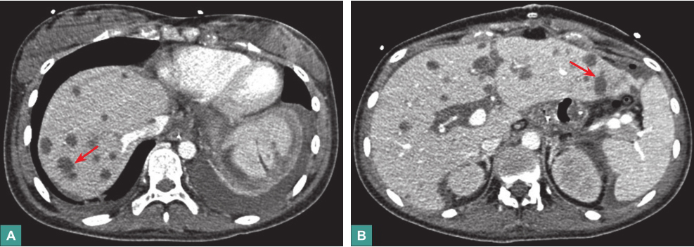 本例患者出现发热,PCT、白细胞计数明显升高,腹部CT平扫示肝实质内多发低密度灶,SOFA评分>2分,脓毒症的诊断成立,肝脏病变首先考虑为感染所致。患者近期有休克、消化道黏膜屏障缺血损伤以及大剂量使用激素等情况,易导致肠道细菌移位,肝脏病灶首先考虑为胃肠道细菌移位导致的迁徙性肝脓肿,需血培养、腹部增强CT扫描等协助诊断,必要时可考虑行局部病灶活检明确诊断。