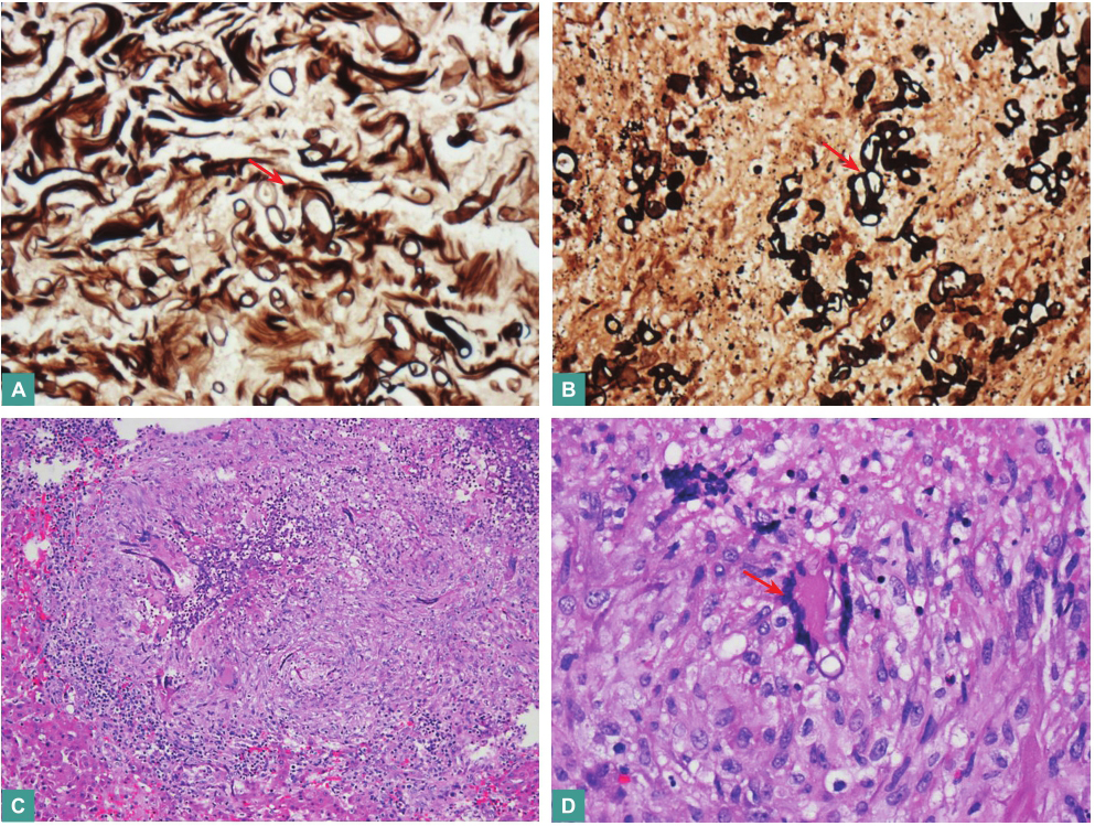 可见大量菌丝生长,菌丝粗大,分支不规则,部分肉芽肿性炎症