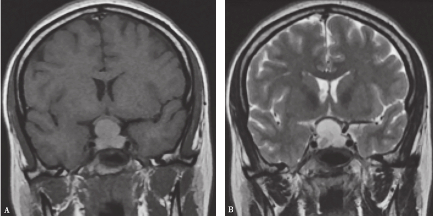Rathke囊肿多位于鞍内或鞍内向鞍上延伸,完全位于鞍上者罕见,更少见者可延伸至蝶窦、海绵窦或额叶。直径大小5~50mm不等,平均10~20mm。在CT上呈低密度、等密度或较脑实质稍高密度影,密度均匀,增强扫描可以无强化或呈环状强化。MRI表现为病变边界清楚、信号均一,通常囊壁不强化,这是与颅咽管瘤鉴别的重要征象;少数情况下囊壁强化,这可能与囊壁炎症反应、含铁血黄素沉积、胆固醇结晶、囊壁鳞状化生或垂体移位等有关。病变信号长短与囊内容物性质相关,如脑脊液样囊内容物呈现短T1、长T2信号,黏性内容物呈现长T1、等T2信号,囊内出血呈现长T1、长T2信号(图1)。
