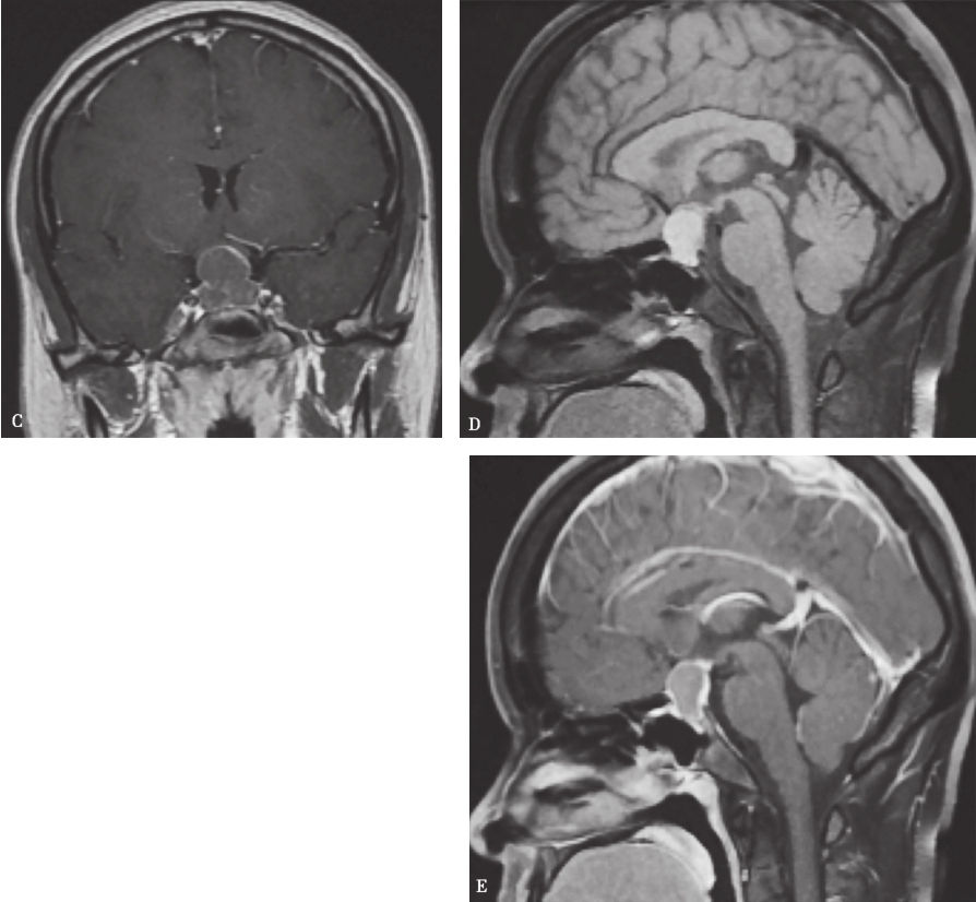 鞍区及鞍上囊性占位,以中线大致对称分布,T1及T2WI 呈高信号,壁菲薄,囊内见T2WI 低信号结节影,增强后呈薄壁环形强化,不完整,囊内结节无明显强化;A.冠状位T1WI;B.冠状位T2WI;C.增强冠状位T1WI;D.矢状位T1WI;E.增强矢状位T1WI