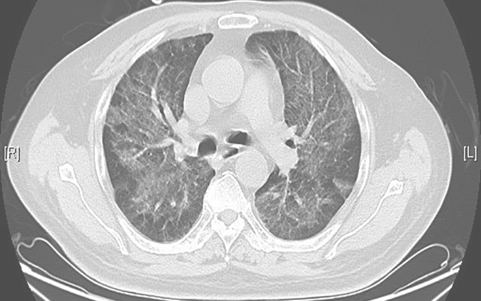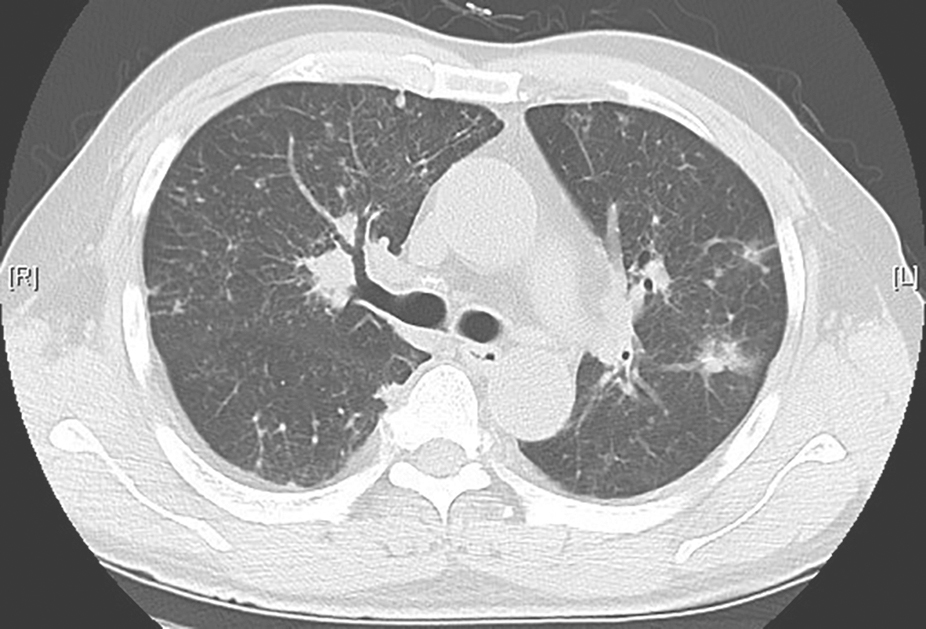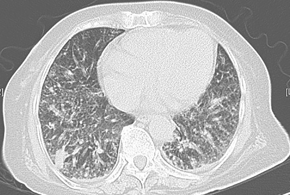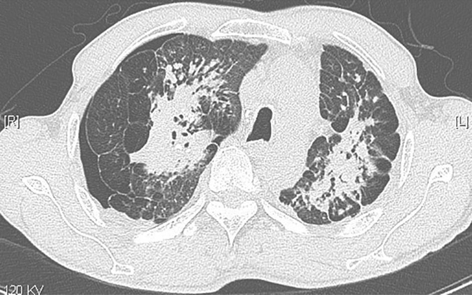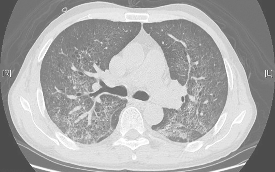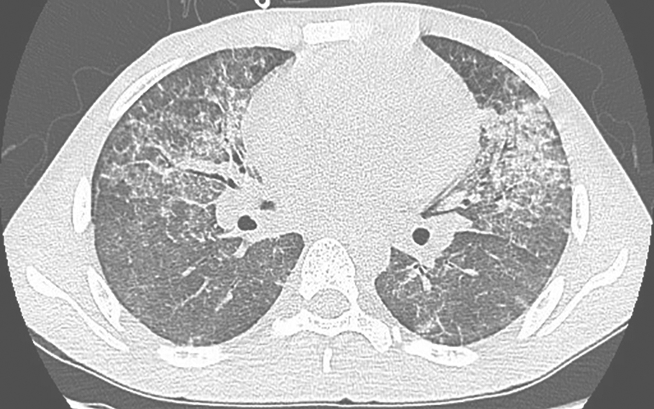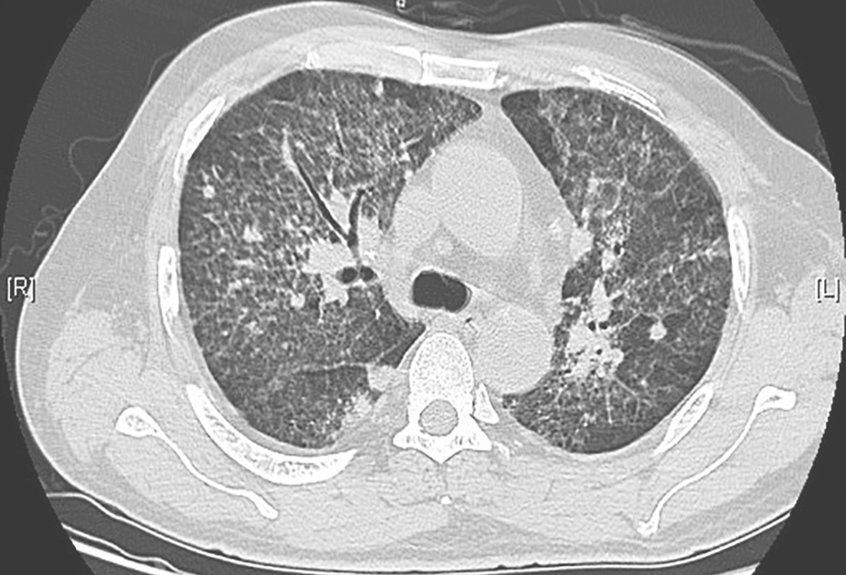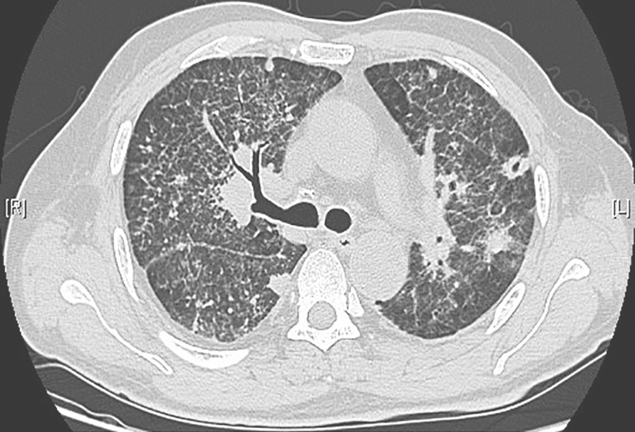 男性患者,57岁,半年前出现活动后气促,伴厌食、体重减轻,未予诊治,气促呈进行性加重。3个月前,患者于外院就诊,胸部CT提示双肺弥漫病变,诊断为双侧间质性肺炎,予激素治疗(甲泼尼龙或泼尼松抗炎累积剂量3530mg)、抗感染及对症治疗后,症状未见明显改善,复查胸部CT提示病灶较前进展,气促加重。20天前,患者无诱因出现反复发热,最高体温达39℃,伴畏寒、咳嗽、咳痰,气促症状进一步加重。患者自发病以来,精神欠佳,睡眠尚可,食欲稍差,大小便正常,体重有所下降(具体不详)。