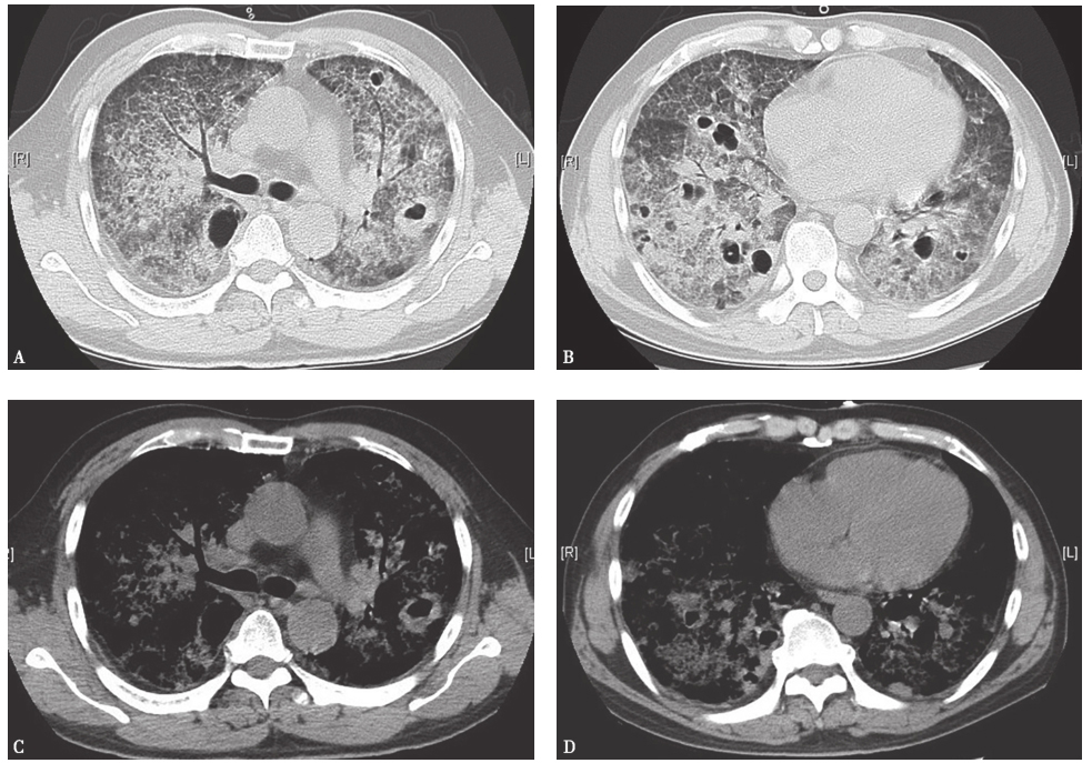 胸部CT:入院前3个月胸部CT示双肺弥漫性间质病变,可见磨玻璃和斑片高密度影,伴部分间质纤维化(图1)。予激素、抗感染及对症治疗后复查胸部CT,见双肺间质性病变较前增多。