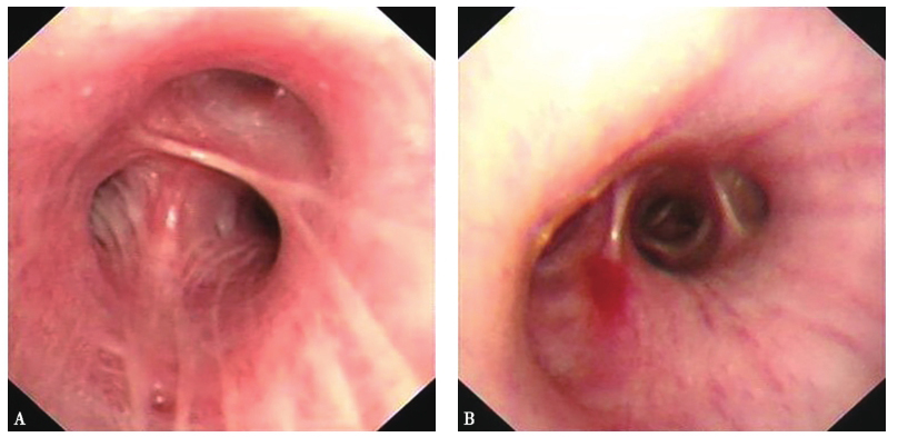 支气管镜检查:镜下见左、右主支气管及双侧各叶段支气管表面见多发散在白色黏稠分泌物附着;支气管肺泡灌洗液未找到肿瘤细胞;小块黏膜病理检查见慢性炎症,黏膜上皮增生。复查支气管镜可见各支气管管腔大量脓性分泌物,支气管肺泡灌洗液培养出恶臭假单胞菌。