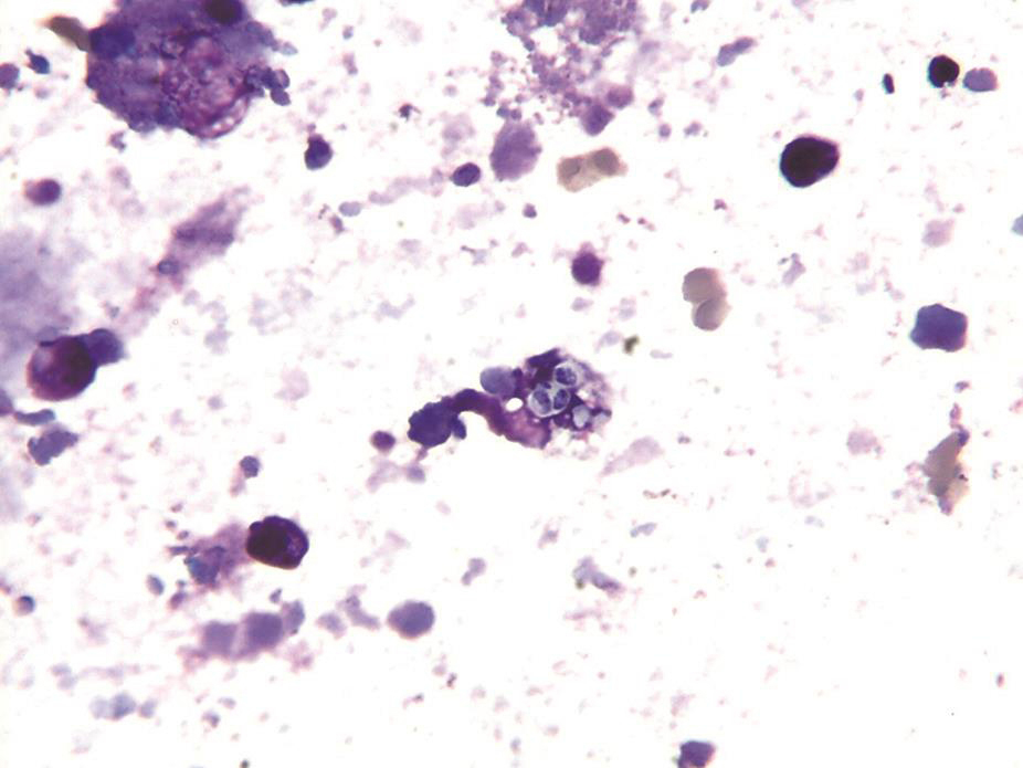 电子气管镜检查:各支气管管腔通畅,未见腔内异常(图9)。BALF呈乳白色浑浊状;细胞学分类为中性粒细胞43%,淋巴细胞25%,嗜酸性粒细胞4%,巨噬细胞28%;抗酸染色阴性,未见恶性细胞。支气管毛刷、BALF未见瘤细胞。BALF曲霉菌抗原阴性。BALF涂片背景见大量红染无定型物质和退变细胞,PAS染色见颗粒状、红染的阳性物质;少量吞噬细胞内可见疑似马尔尼菲青霉菌(图10)。