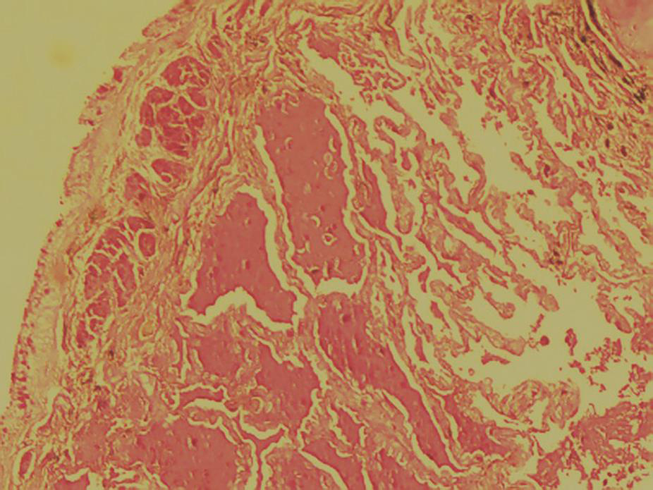 经支气管肺活检:肺支气管黏膜炎症不明显,肺泡腔扩张,腔内有红色渗出液(PAS染色阳性)(图11),肺泡间隔纤维组织轻度增生,间质少量慢性炎症细胞浸润,符合肺蛋白沉着症表现。