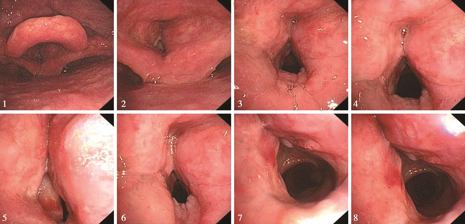 1.2017年5月25日电子鼻咽喉镜检查 内镜所见:“喉癌术后1月余”,鼻腔内镜勉强通过。鼻咽部结构完整,黏膜光滑,未见明显异常。口咽双侧扁桃体未见肿大。舌根部淋巴滤泡增生。喉腔全切除,下咽部黏膜充血,未见明显肿瘤征象(图7)。
