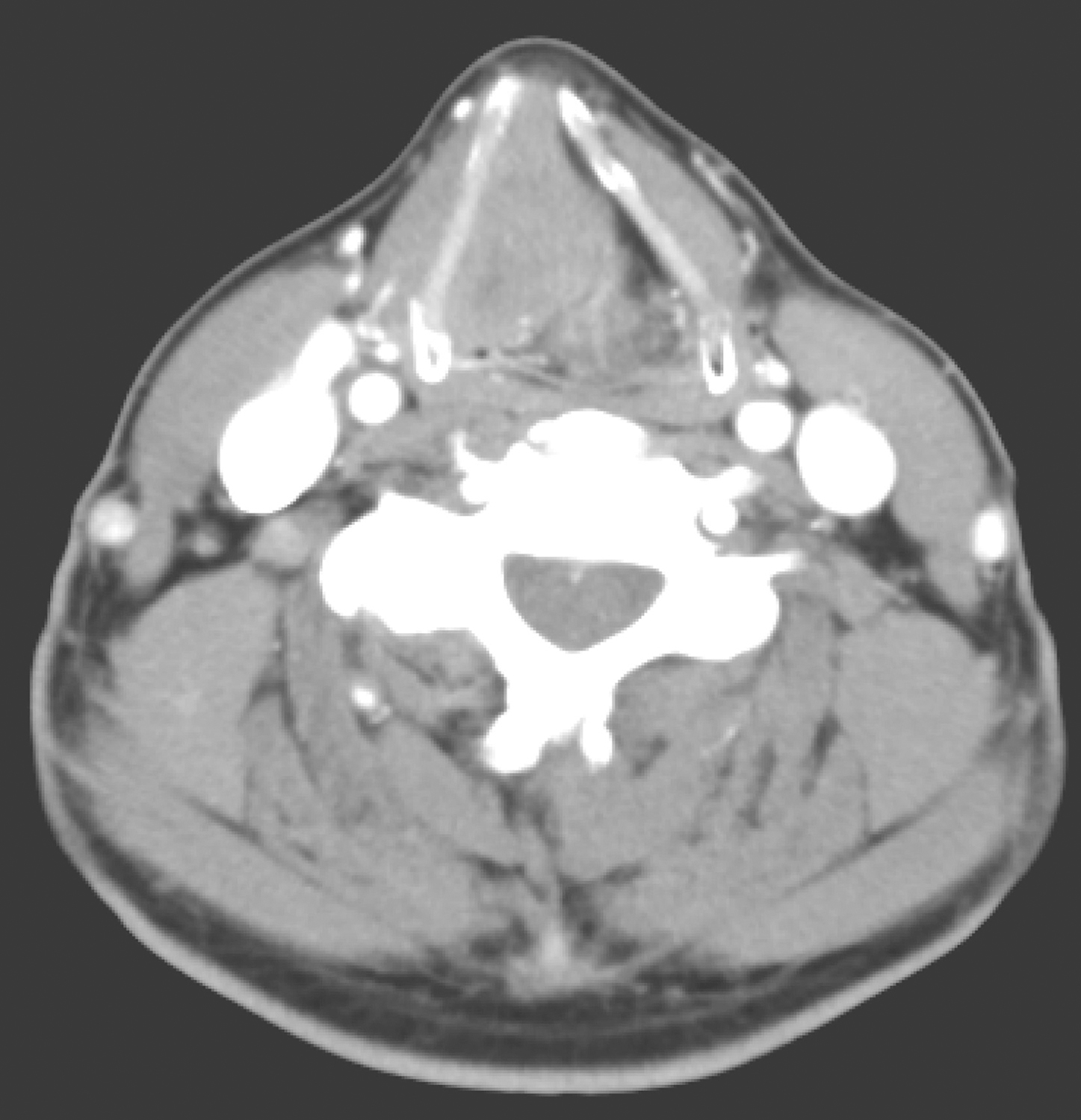 (1)扫描范围内气管造瘘术后,喉部呈术后改变,局部软组织增厚、肿胀,喉腔消失,增强扫描尚均匀强化,未见明显肿物。