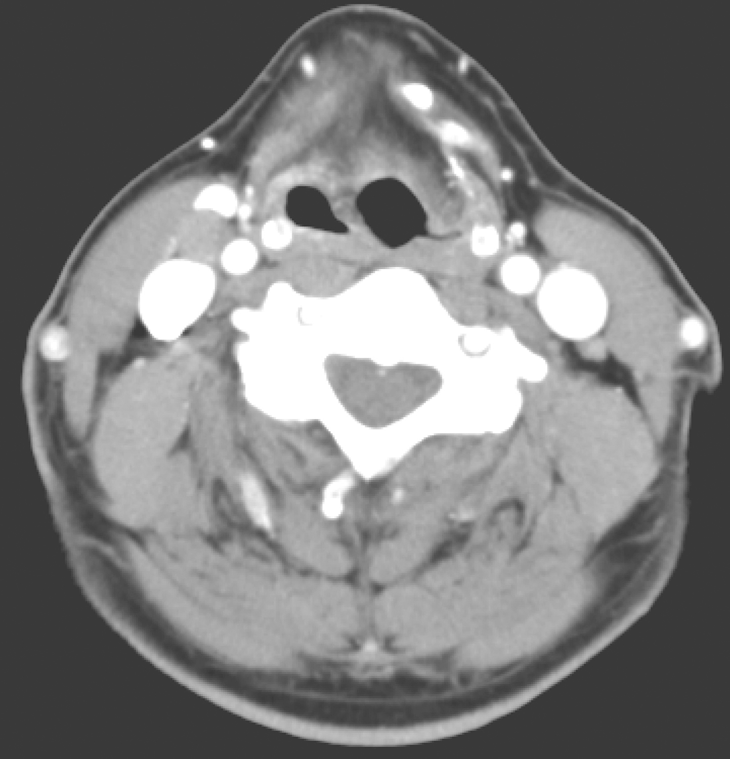 患者男性,73岁。因声音嘶哑8个月于2017年3月24日收入本院头颈外科。2016年8月患者无明显诱因出现声音嘶哑,逐渐加重,当地医院给予对症治疗,效果不佳,即到北京同仁医院诊治,喉镜检查提示右侧室带、声带占位;活检病理报大部分为鳞状细胞原位癌,部分区域有浸润,为进一步诊治来本院。本院门诊检查,电子鼻咽喉镜提示喉部会厌及左侧劈裂结构基本正常,右侧室带明显增厚,右侧劈裂略显肿胀,病变向下侵及右侧声带,未侵及声门下;左侧声带前端被遮盖,情况不明;左、右半喉活动尚可;颈部CT提示右侧室带、声带肿物,可符合癌,右侧颈部Ⅱ区淋巴结转移。为进一步治疗收入院。发病以来,精神尚可,食欲尚可,大小便基本正常,体重无明显变化。既往史:母亲子宫内膜癌;吸烟40余年,20支/d;偶尔饮酒。