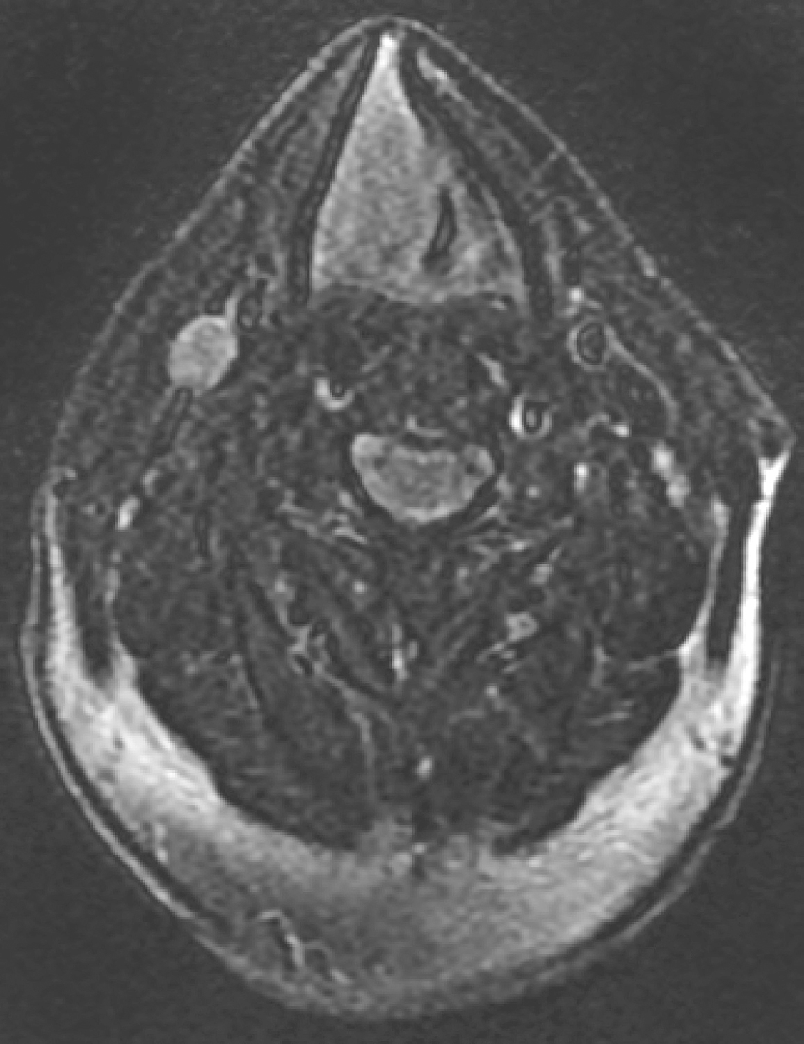 检查所见:右侧室带、声带区可见不规则肿物,最大横截面约3.6cm×1.8cm,T1WI等信号,T2WI/FS中高信号,DWI扩散受限明显,增强扫描呈略不均匀明显强化,病变侵犯右侧喉旁间隙,宽基底贴邻甲状软骨,凸向喉腔,推压对侧声带及室带,喉腔变窄,向前累及前联合(图4)。右侧Ⅱ、Ⅲ区可见多发淋巴结肿大,大者短径约0.9cm(图5)。左颈部Ⅱ区小淋巴结,大者短径约0.5cm。扫描范围内下咽、颌下腺及甲状腺未见明确异常。