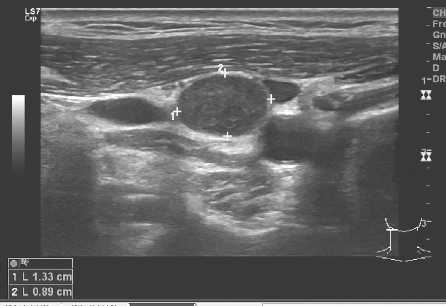 右颈Ⅱ区可见一低回声结节,约1.3cm×0.9cm,边界清楚,未见血流信号(图6)。余颈部及锁骨上未见明确肿大淋巴结。