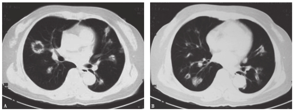 男性患者,58岁,咳嗽、咳痰3个月,气喘2个月,诊断为肺转移性腺癌。胸部CT见双肺多发结节性病变,部分空洞形成