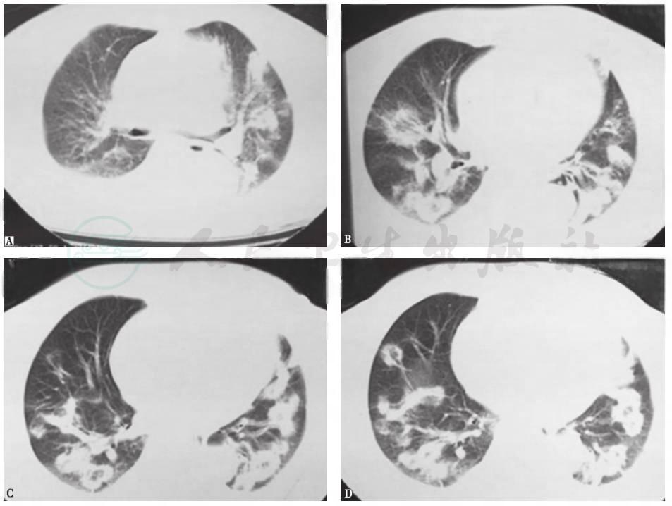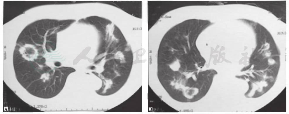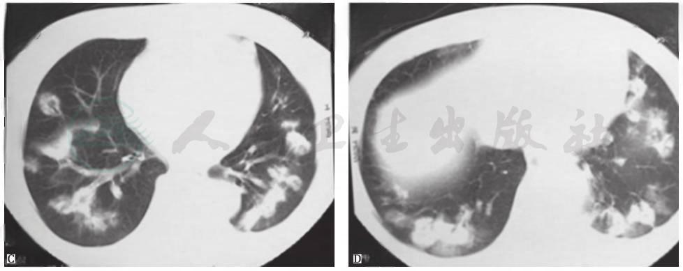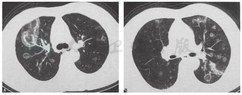 4.影像学检查见肺多发大小不一的结节影,部分呈环状,病灶进展快。