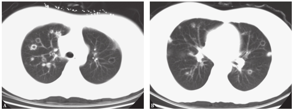 肺部疾病的常见症状和体征包括咳嗽、咳痰、胸痛、咯血、呼吸困难、肺内湿啰音或哮鸣音,但这些表现并无病因特异性,许多原因均可表现为同样的症状和体征。本例患者的临床症状为咳嗽及活动相关性胸闷,影像学表现以肺多发结节样及环状病灶为主。