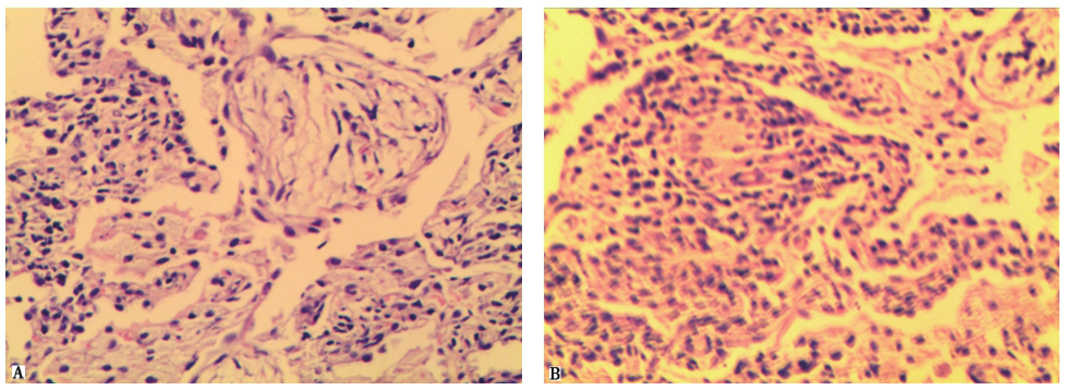 经患者本人和家属同意,对患者实施了CT引导下经皮肺穿刺活检术。术后活检组织病理检查见肺泡间隔增宽,间质纤维组织增生,部分肺泡腔内纤维组织呈息肉样增生(图9A)及多量慢性炎症细胞浸润,符合机化性肺炎表现(图9B)。
