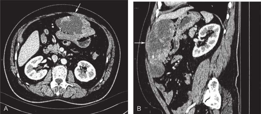 患者呈急性面容,皮肤黏膜苍白,未见黄疸,浅表淋巴结未触及肿大,双下肢不肿。腹部饱满,可见手术瘢痕,无静脉曲张,未见胃肠型及蠕动波;腹部稍硬,有压痛但无反跳痛,中上腹可触及一形状不规则的较大肿物,质地稍硬,大小不易估计,活动性差;肝脾肋下未触及;Murphy征(-),移动性浊音(-);肠鸣音约6次 /min。