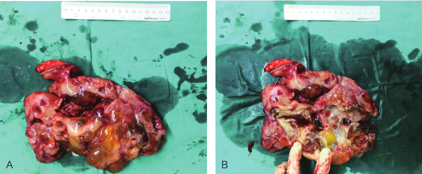进行充分的术前准备后,于2018年7月20日行剖腹探查,术中发现腹腔内粘连严重,上腹部可见一大小约16cm×18cm的囊实性肿物,形状不规则,与胃窦大弯侧及大网膜关系密切,但未侵犯其他脏器。在松解腹腔内粘连,充分暴露肿块后,行胃部分切除术,完整切除肿块。术中出血约50ml,手术过程顺利(图3)。