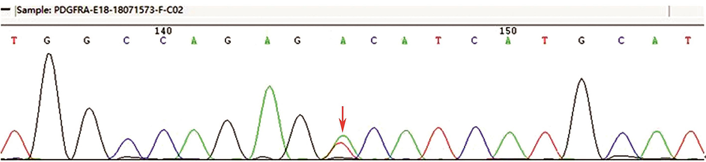 基因检测:PDGFRA基因外显子18发生突变,突变类型为c.2525A>T(p.D842V)(图 4)。