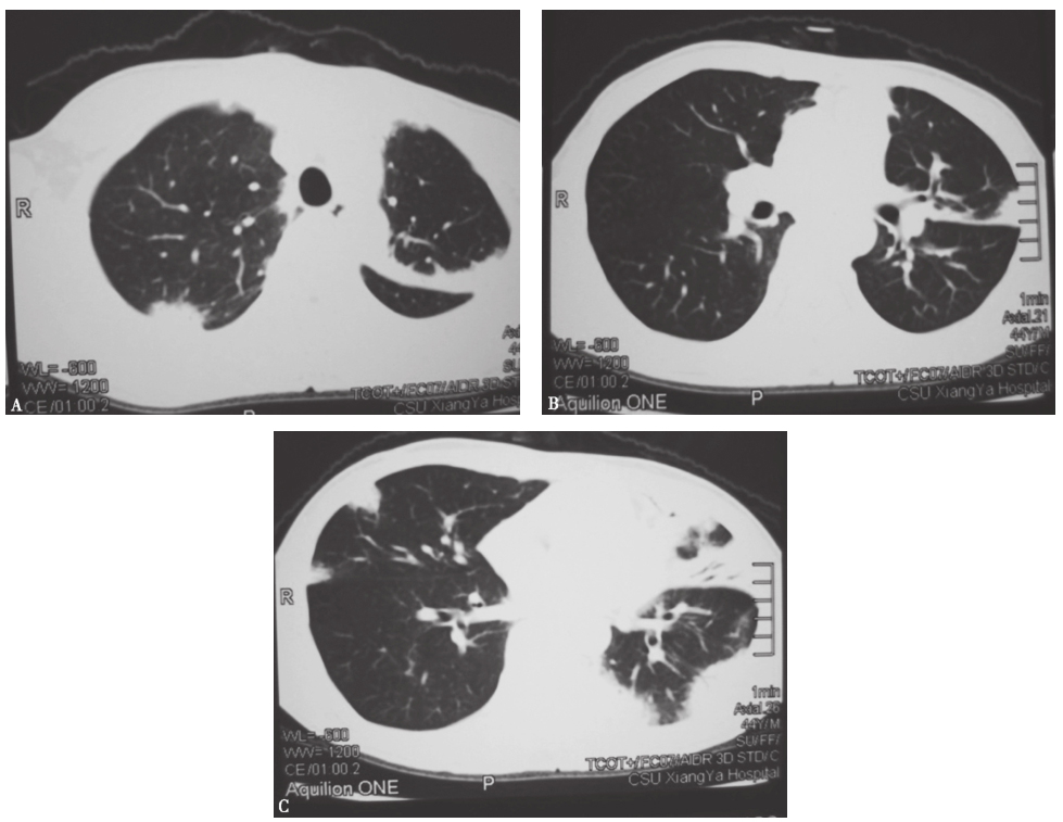 男性患者,44岁,3个月前(2012年10月1日)无明显诱因出现反复咳嗽,无痰,于当地诊所行抗感染治疗(具体不详),病情无好转。1个月后,患者因偶发左侧胸痛(为牵拉性疼痛,可耐受,与咳嗽无关系),以“肺部感染,胸腔积液查因”于当地医院住院治疗。患者住院期间,先后以头孢哌酮钠舒巴坦钠联合阿奇霉素治疗6天,莫西沙星治疗6天,白细胞升高无改善,改为哌拉西林钠他唑巴坦钠联合阿米卡星治疗,仍出现发热(午后和夜晚发热,温度波动在37.3~38.5℃)伴盗汗。经抗感染对症治疗18天,患者上述症状无缓解,要求出院,并于出院后改服中药,服药后开始咳痰(淡黄色黏液痰),服药第4天体温升至38.9℃,遂于第6天停药。发病3个月时(2012年12月31日)到我院就诊,以“发热并双下肺病变查因:感染?结核?”入院治疗。患者发病以来精神欠佳,食欲可,二便正常,体重无明显减轻。