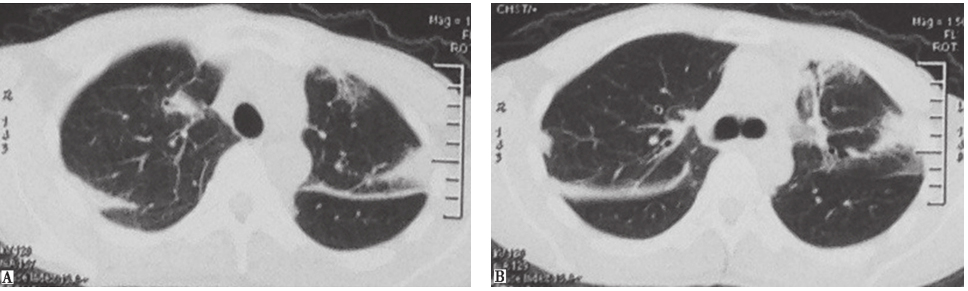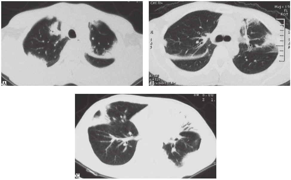 2013年1月4日查胸部CT,见双肺多发实变影,其间可见支气管充气征,伴左侧少量胸腔积液(图1)。