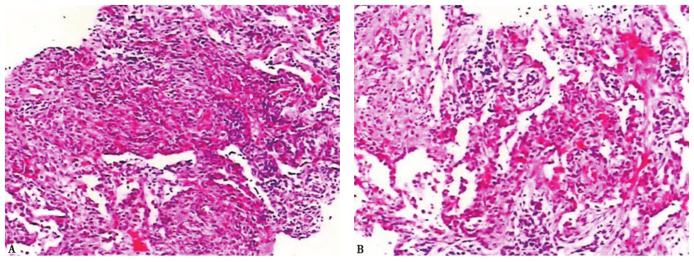 综上所述,患者无明显诱因出现咳嗽、发热,抗生素治疗效果不佳,相关检查不支持结核分枝杆菌感染,肺穿刺活检提示机化性肺炎,可见肺组织中淋巴细胞、浆细胞浸润,局灶性纤维增生,局部淋巴滤泡形成,未见中性粒细胞等急性炎症浸润征象。其他相关辅助检查也排除了继发性机化性肺炎因素。根据现有临床、胸部影像学和病理学表现,予糖皮质激素治疗,治疗后症状改善,病灶有所吸收,支持隐源性机化性肺炎诊断。