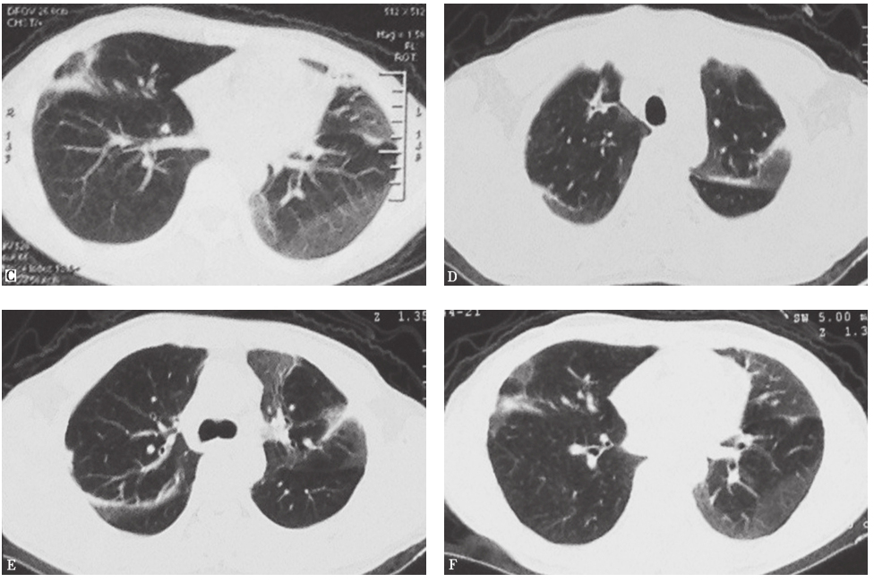 A~C.2013年1月30日(泼尼松40mg治疗2周后)胸部CT显示肺部病变较前明显好转;D~F.2013年2月20日(泼尼松治疗6周后)胸部CT提示肺部病变较前进一步好转