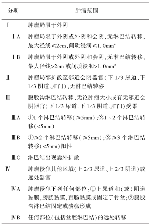 2009年国际妇产科联盟(FIGO)妇科肿瘤委员会对外阴癌的FIGO分期作了最新的改动,将Ⅲ期进行了细化,突出了淋巴结转移的意义,详见表1。因外阴癌是位于体表的肿瘤,易于早期发现、早期诊断,美国以人群为基础的癌症登记资料显示,90%的患者可在癌前病变期或早期确诊:癌前病变(328例,占64.1%),Ⅰ期、Ⅱ期共141例,占27.5%;Ⅲ期35例,占6.8%;Ⅳ期仅8例,占1.6%。我国目前尚没有这方面的大数据报道。