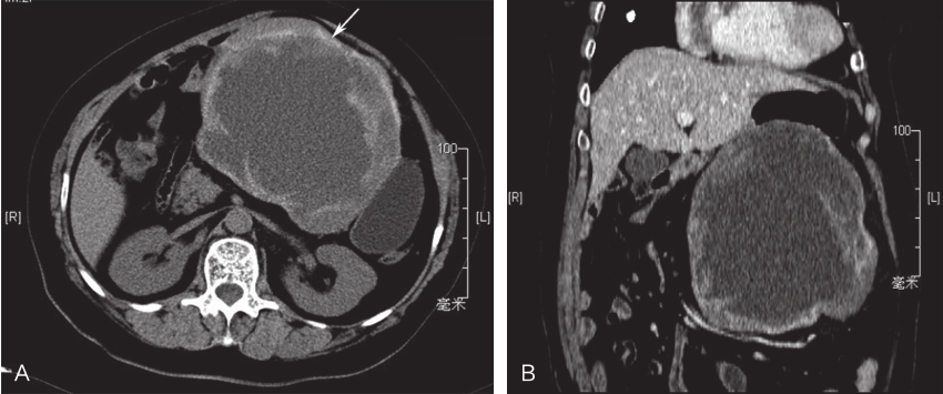 胃肠间质瘤(gastrointestinal stromal tumor,GIST)大体病理特点多为规则、质软的实质性肿块。虽然有部分GIST呈囊性变,但极少GIST发现时即为显著囊性变,实性部分仅占极低比例。这类呈显著囊性变的GIST术前诊断较为困难,而且也难以使用现行的危险度分级标准评估其术后复发风险及恶性程度。