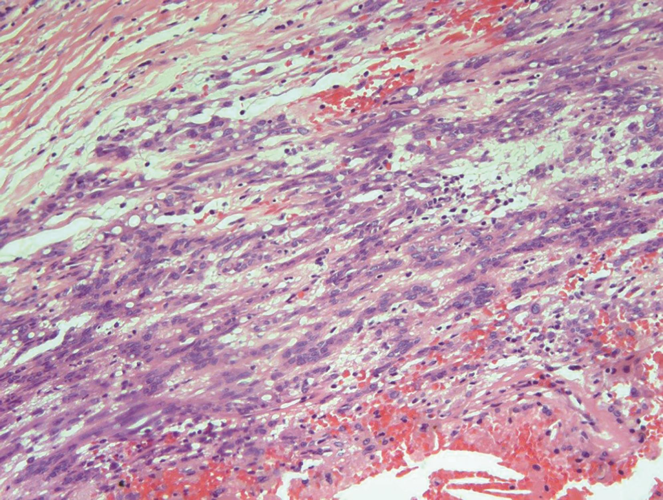 术后病理:胃肠间质瘤,上皮样细胞为主型,细胞丰富密集,明显异型,散在少量瘤巨细胞,灶性坏死,核分裂象难见,形态学提示为低度恶性胃肠间质瘤(图2)。